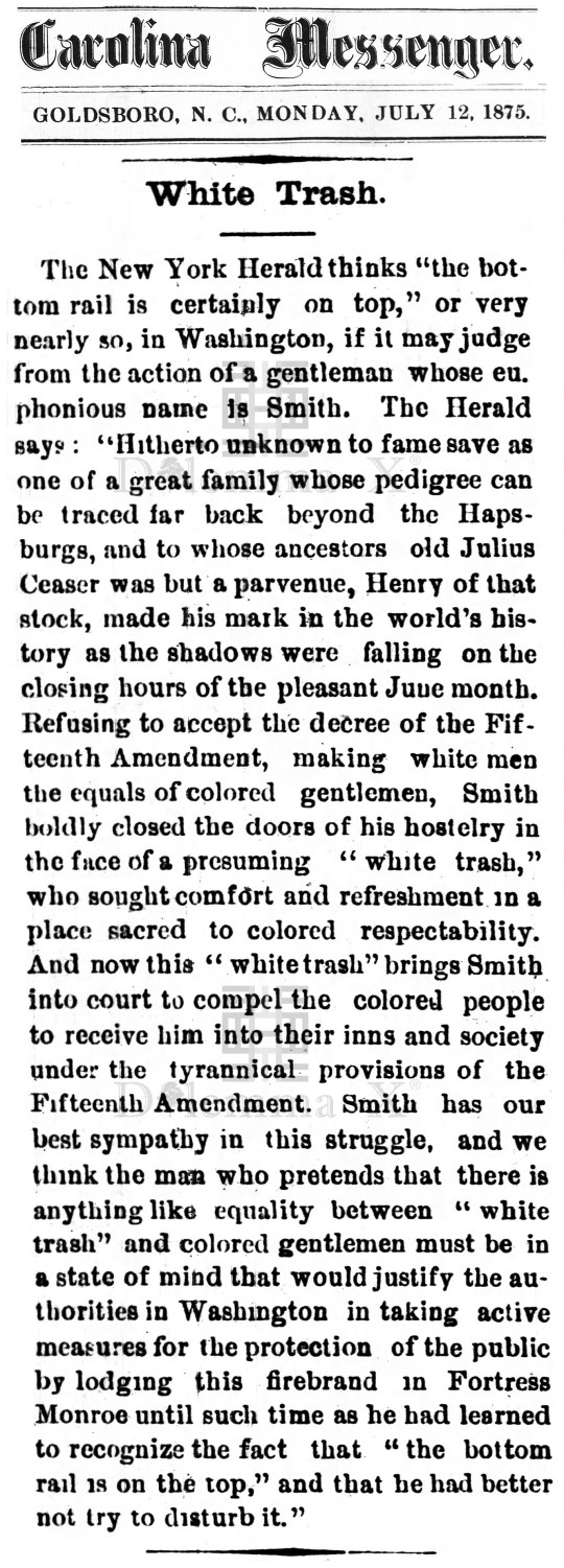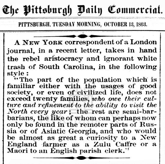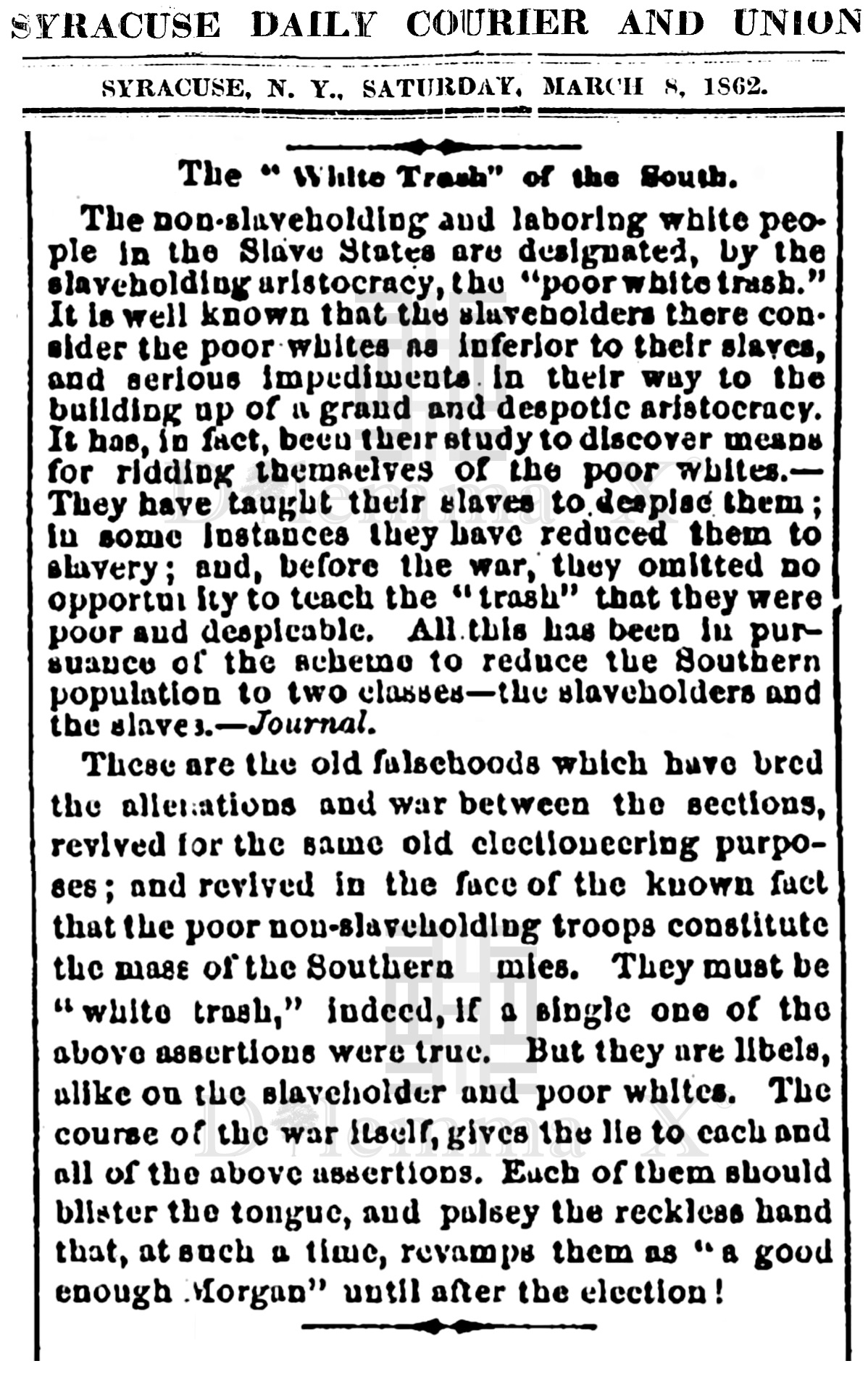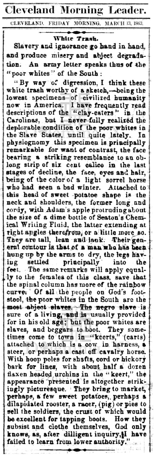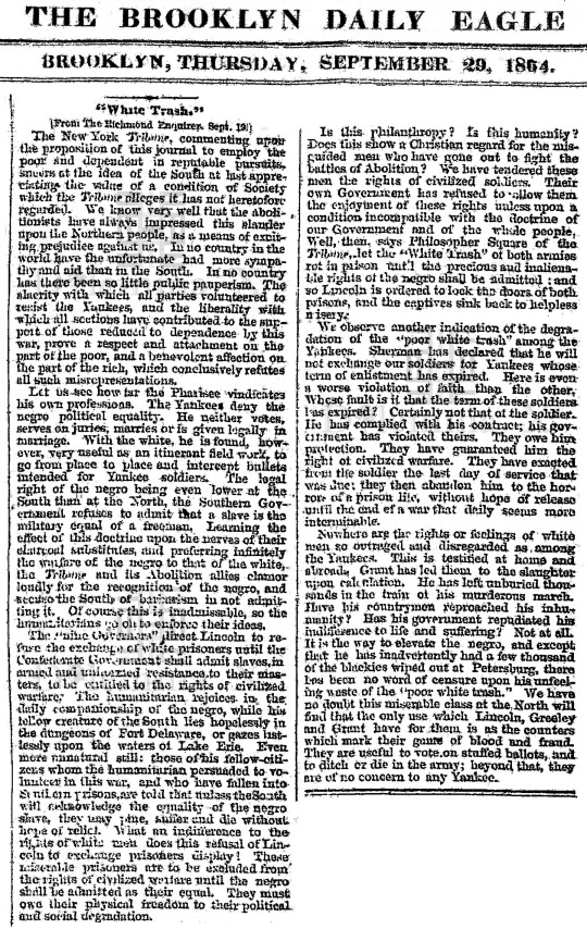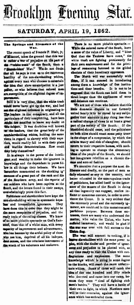 During the Civil War these historical newspaper articles expose how poor whites in the South were used as pawns to protect Southern aristocratic white wealth. The term “white trash” is the common term used in the press during the Civil War.