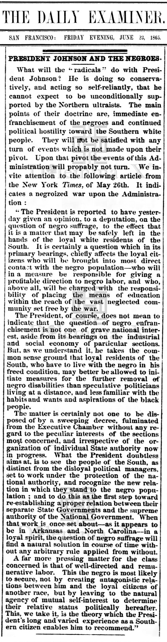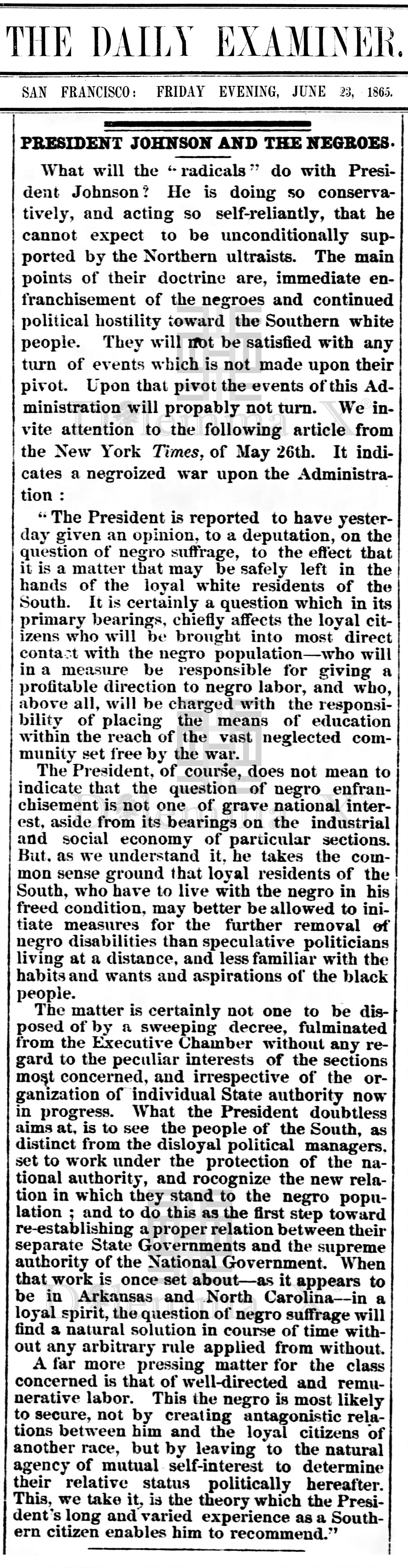 June 1865 President Andrew Johnson’s view on former enslaved African Americans