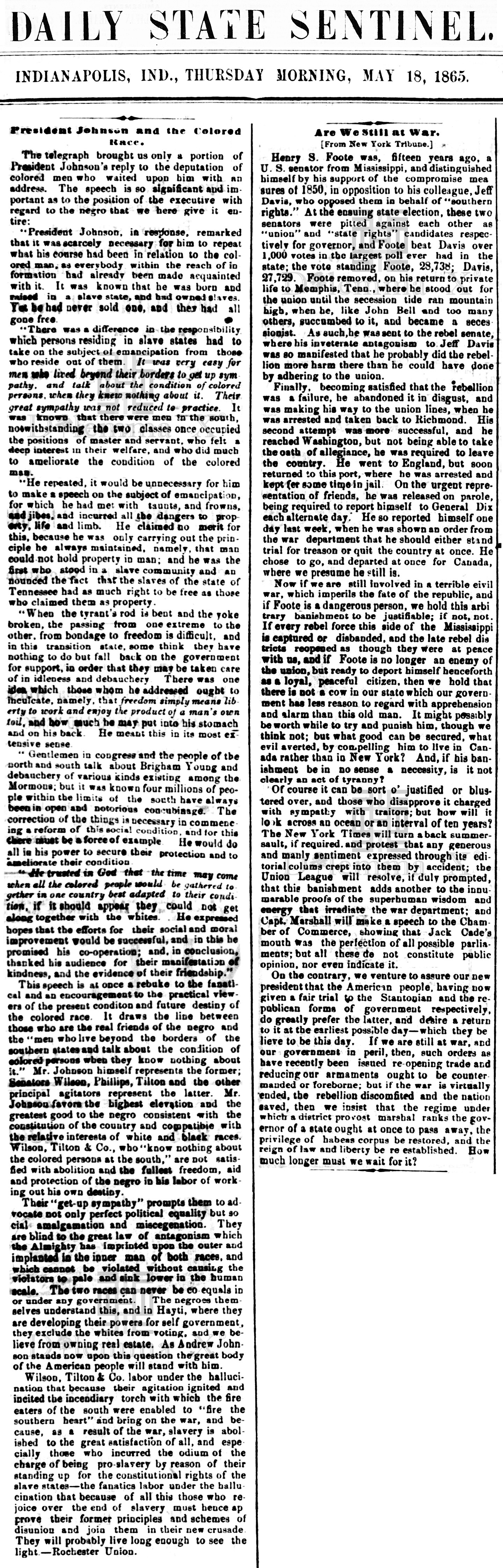 May 1865 – President Andrew Johnson’s statements regarding formerly enslaved African Americans