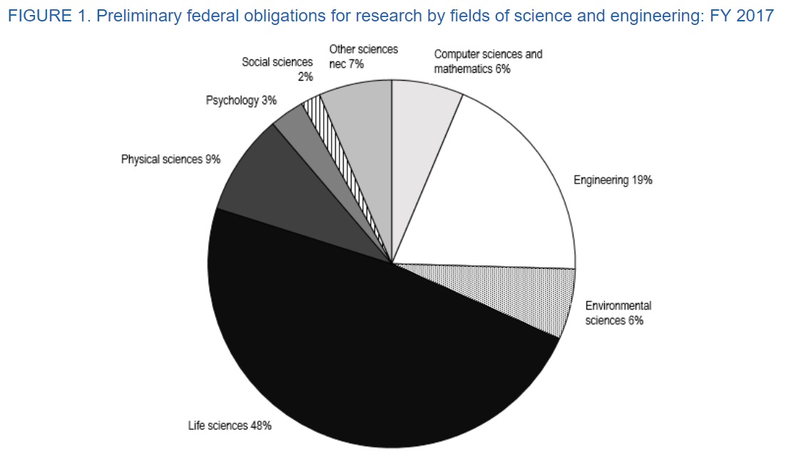 In FY 2017, obligations for research accounted for 56.2% of all federal R&D obligations. The Department of Health and Human Services (HHS) accounted for the largest share of federal research obligations (48.4%) with $32.2 billion in FY 2017.