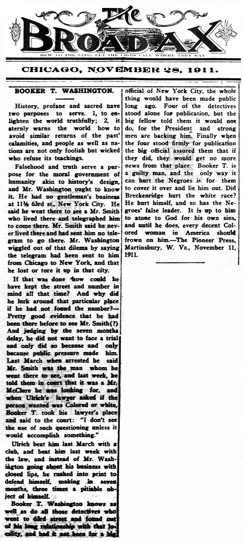 Taylor relocated the newspaper to Chicago, Illinois in 1899 due to conflict with the Latter Day Saint. The Broad Ax was viewed as a “controversial” black newspaper in Chicago due to its criticism of Booker T. Washington. The Broad Ax often made extravagant circulation claims.