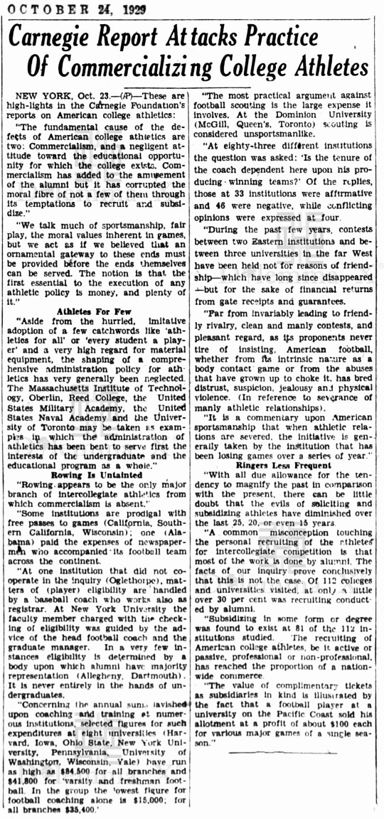 Long before the current conversation regarding allowing NCAA student athletes to receive payment for their athletic performance from their universities there was a conversation that took place in 1929.