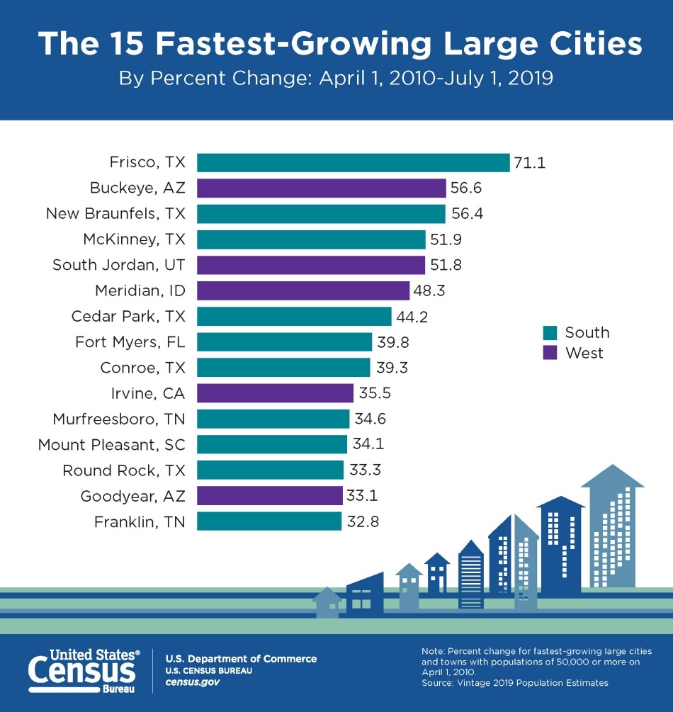 “Frisco, Texas, tops the list of the fastest-growing large cities with a growth rate of 71.1%, increasing its population by more than half since April 1, 2010,” says Amel Toukabri, chief of the Local Government Estimates and Migration Processing Branch in the Census Bureau’s Population Division. For a complete list, see fastest-growing large cities 2010-2019.
