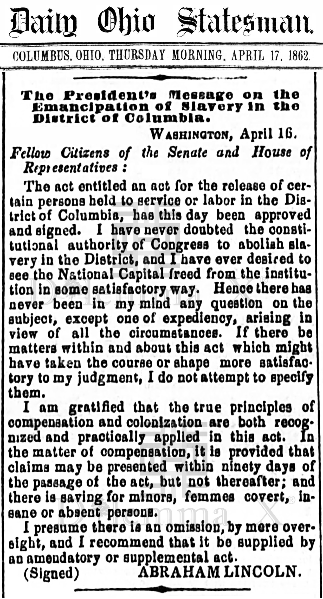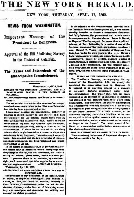 1862 April 17 The emancipation of enslaved Africans in the District of Columbia