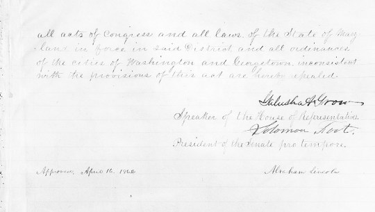 On April 16, 1862 President Abraham Lincoln signed a bill ending slavery in the District of Columbia. Passage of this law came 8 1/2 months before President Lincoln issued his Emancipation Proclamation for the Confederate States of America.
