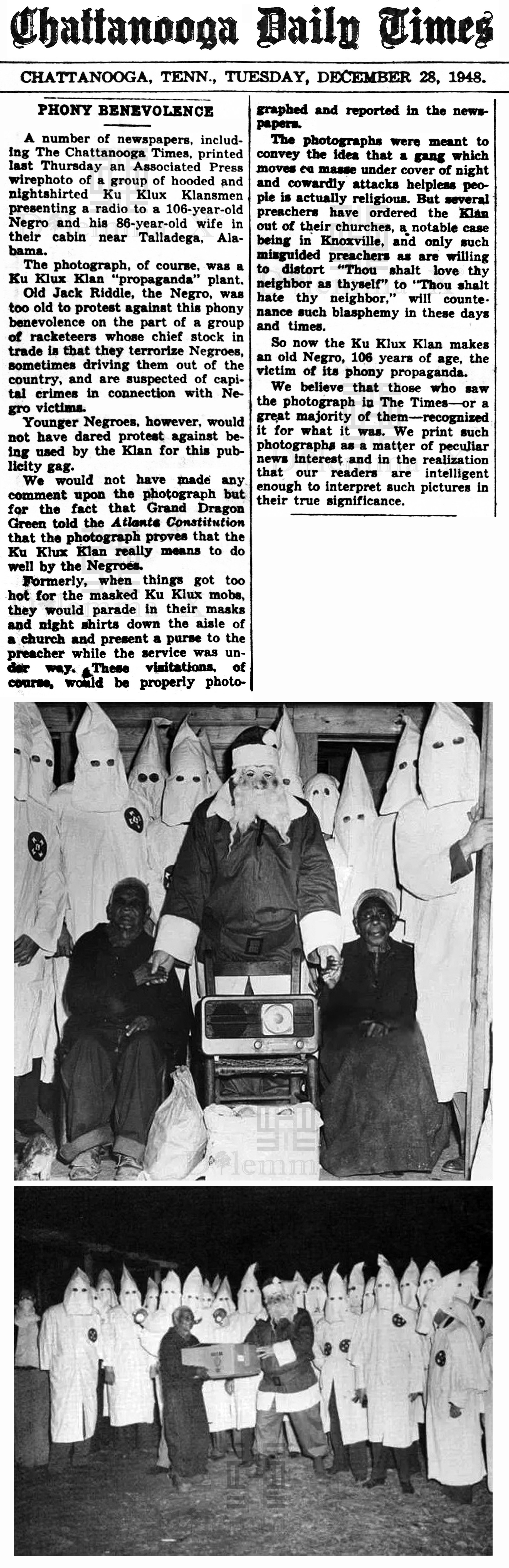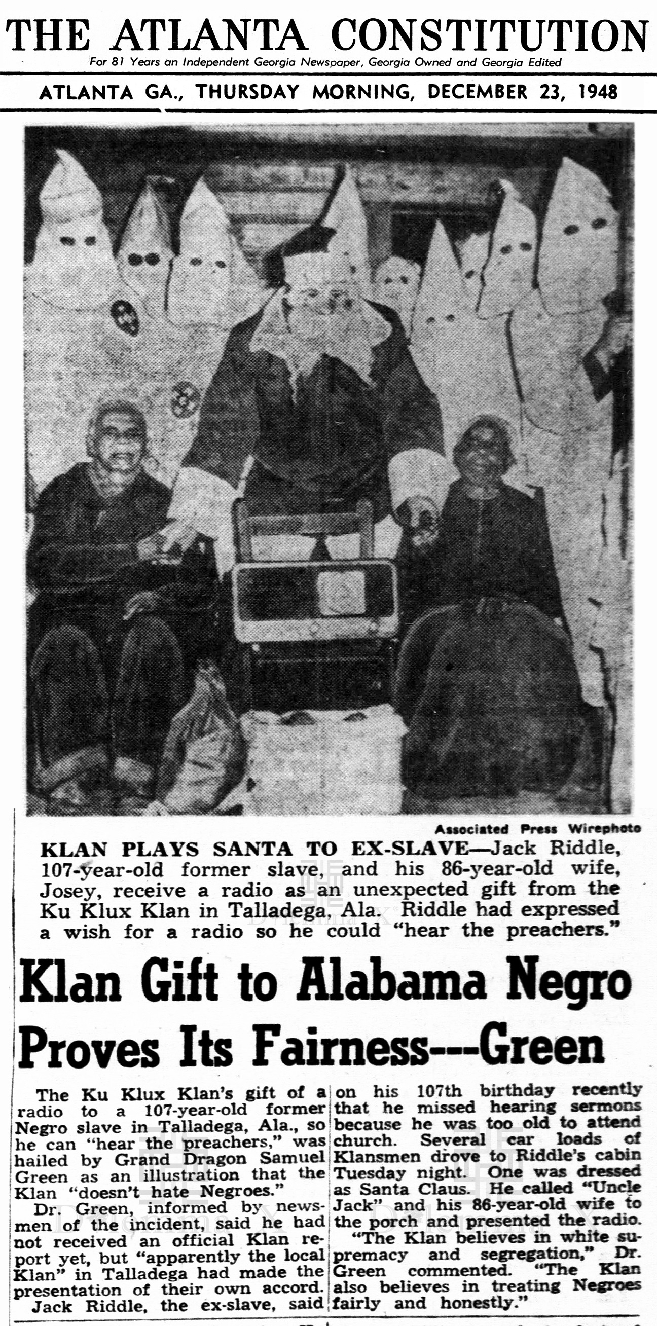 In 1948, an elderly African American couple in Talladega, Alabama were humiliated by taken a propaganda photo with the Klu Klux Klan during the Christmas holiday season. They were said to have been Christmas gifted a radio. In the photo were Mr. Jack Riddle, who was then age 107 and his wife Mrs. Josey Riddle.