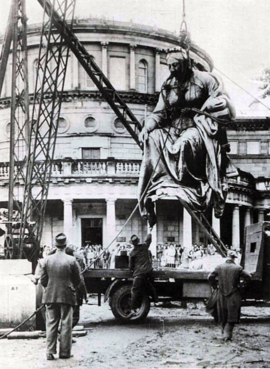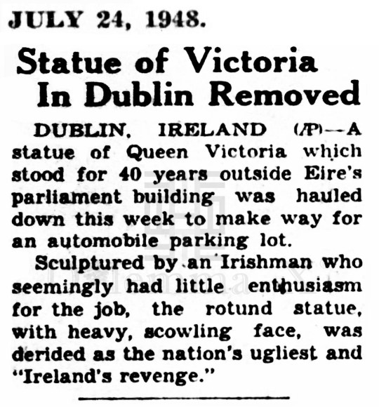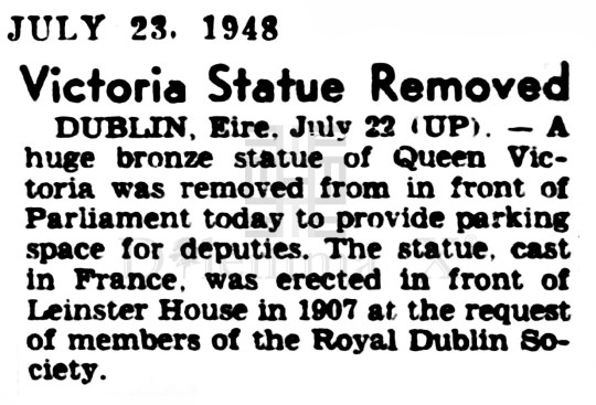 Removal of the Queen Victoria monument, July 1948, from Leinster House, Dublin, Ireland (later given to Sydney, Australia). [The Irish Times, July 23, 1948, p.1]