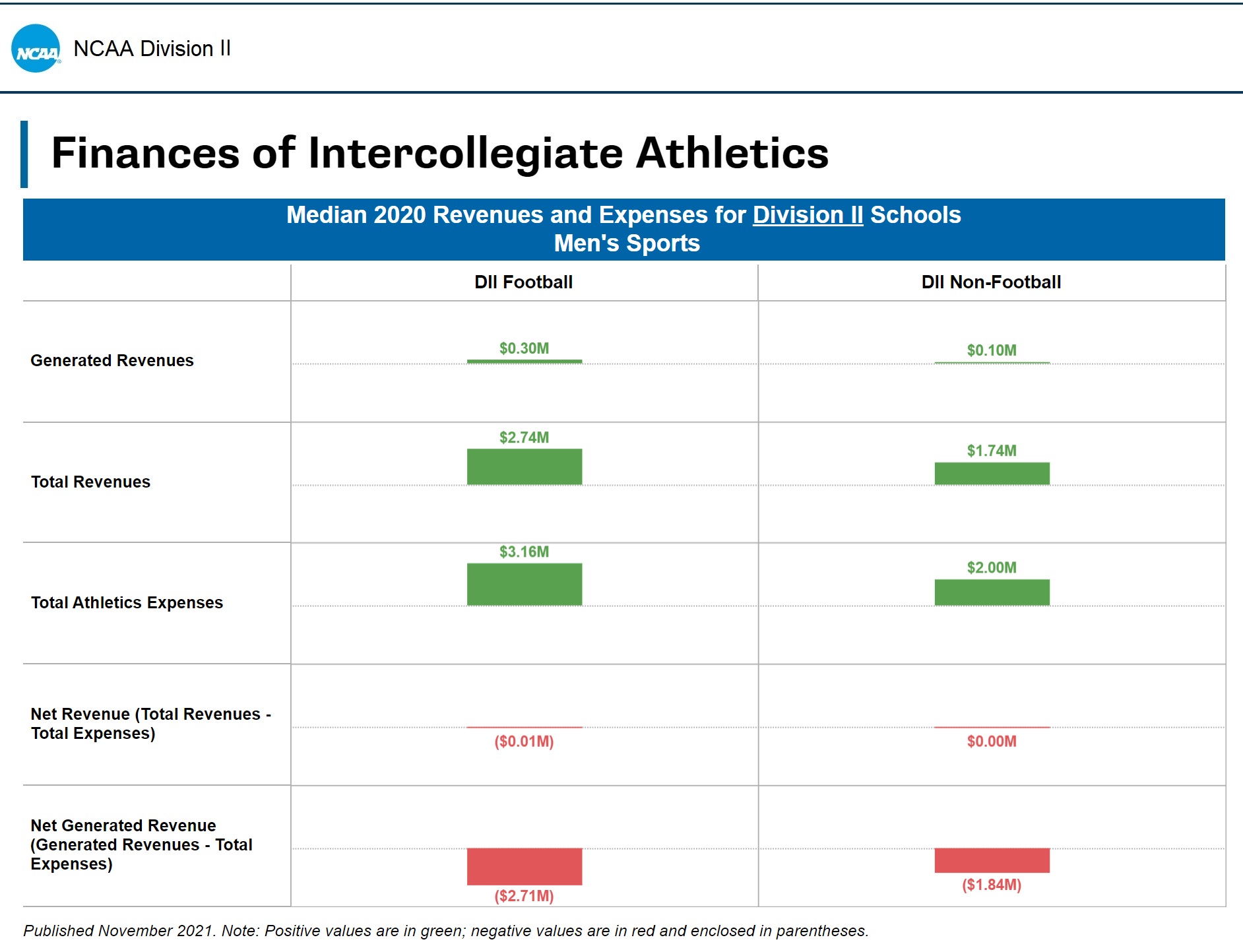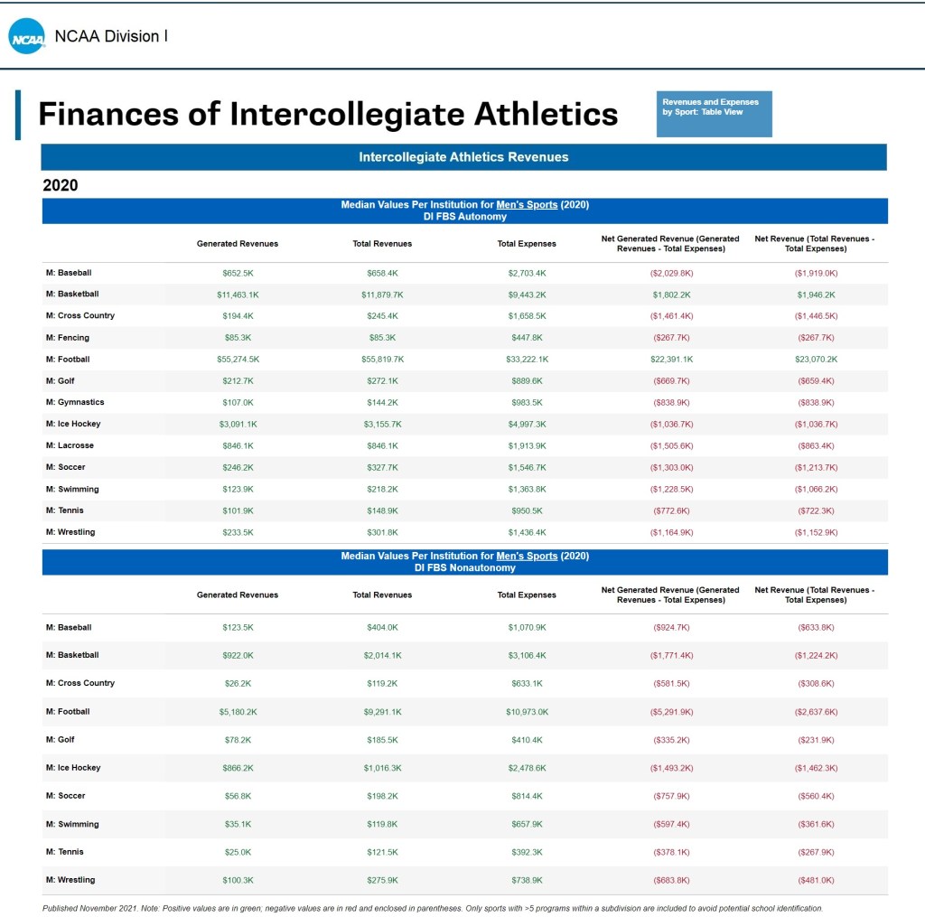 The data is provided annually by all active and provisional NCAA Division and Division II member schools via the NCAA Membership Financial Reporting System. Half of all active and provisional NCAA Division III schools are included in financial reporting.