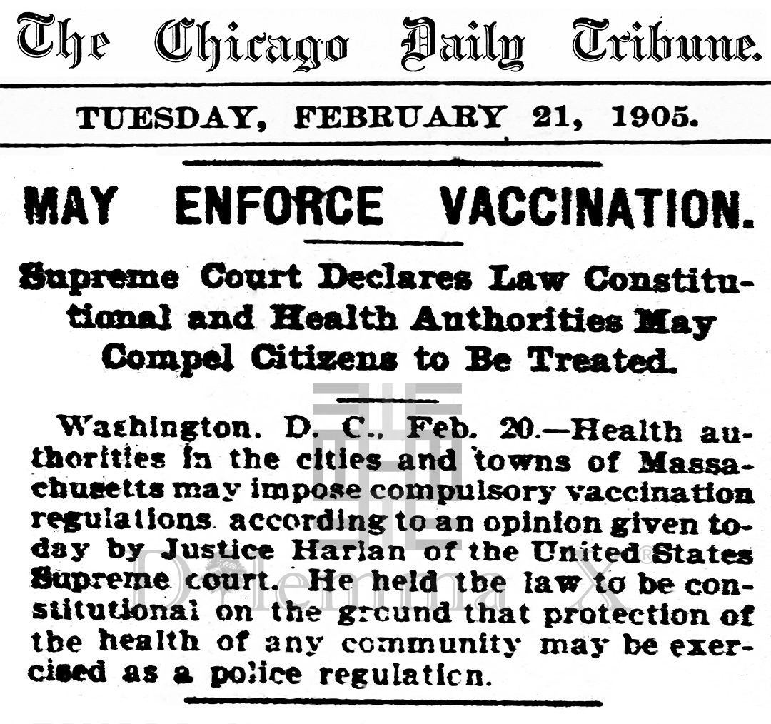 Jacobson v. Massachusetts 1905, the Supreme Court upheld a state’s mandatory compulsory smallpox vaccination