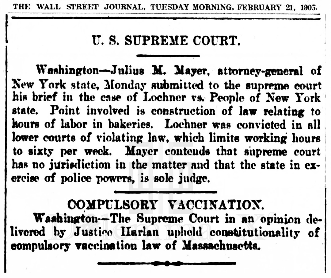 Writing for the 7–2 majority, Justice Harlan rejected Jacobson’s arguments. He grounded the opinion in social compact theory and state police power — that is, the power of the states to protect public health and safety. Constitutional liberties, he wrote, are limited by a fundamental “social compact” and the “government is instituted ‘for the common good, for the protection, safety, prosperity and happiness of the people, and not for the profit, honor or private interests of any one man.’” The Court recognized a sphere of protected individual liberties, but insisted that the state had broad powers to encroach on that sphere when “the safety of the general public may demand.”