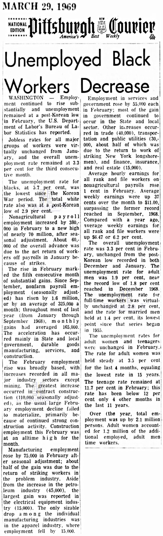 The following information briefly covers the pre 1970s economic conditions in the United States for African Americans. when there was a lower unemployment rate compared to the unemployment rate release on January 5, 2018.
